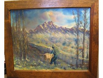 This wonderful oil painting is titled "Elliot S. Barker's Trail" and features Barker and his dog Puce on a trail in Pecos near Inspiration Point.