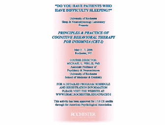This weekend training seminar on CBT for Insomnia is offered on May 5th -- May 7th at the University of Rochester in Rochester, New York. The seminar will provide information on both pharmacologic and non-pharmacologic treatment. The majority of the course, however, will be focused on how to conduct Cognitive Behavioral Therapy for Insomnia (CBT-I)as an evidenced based intervention for Primary and Secondary Insomnia. The seminar will be divided into five parts, which include: