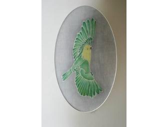 Exquisite batik art of bird in soft green, yellow and gray. This piece was made by Summit parent, Holly Hay.