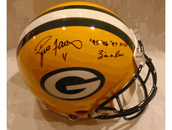 This very special and rare authentic Proline Green Bay Packers Helmet is hand signed by Brett Favre and hand inscribed "Brett Favre #4,95,96,97 MVP,3 in a row". This is one of the most unique helmets ever done by such a legend of the NFL. Certificate of Authenticity is included.