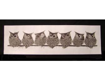 Limited edition block print "Seven Owls" on rice paper by Mr. Carmine DeVivi. Numbered 117 out of 200. Signed and numbered by Artist. Print measures approximately 27" x 8" inches and is UNFRAMED. One end has slight crease in paper.