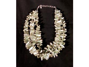 Unusual multi-strand natural pearl necklace with silver chain clasp. Irregular shaped natural pearls in green/yellowish iridescent colors. Perfect accessory for any outfit!