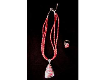 Lovely southwestern style necklace with pendant and matching ring. Multi-colored orange design, coral/oyster shell materials, and sterling silver setting.