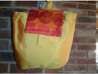 Gold Lily Black backpack style purse pink and black swirl design on red background closure flap. Inside has a zippered pocket as well as two other pockets for organizing purse contents 12x13