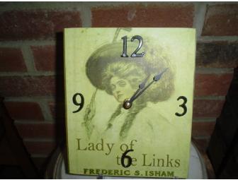 Clock in the style of an old book Title: Lady of the Links by Frederic S. Isham Illustration of a lady wearing a dress hat and holding a golf club in tones of greens