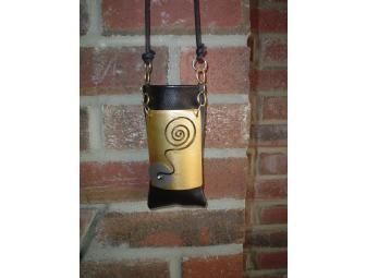 Black leather case that can be worn as purse on shoulder or around the neck. Features a gold plate on front with a silver circle and black swirl design. Small pocket on back large enough to hold a credit card and/or lipstick for an evening out