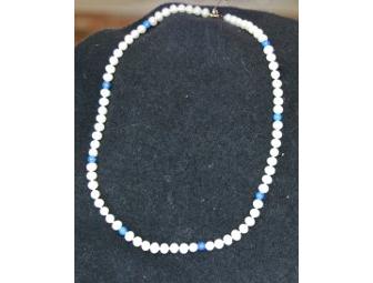 Beautiful pearl with blue bead accents necklace. Great for any mom on Mother's Day.