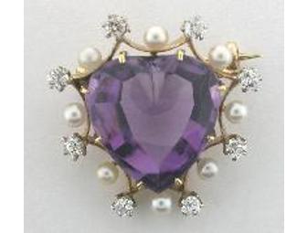 Breathtaking!14k yellow gold estate brooch, signed Black, Starr and Frost, set with a heart shaped amethyst cabachon, seed pearls and diamonds totaling approximately .40 cts.