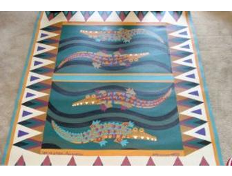 34" x 41" handpainted floor cloth with alligators in earth tones. Artist is B. Priestley.