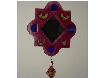 Beautifully designed ceramic mirror.Purple, gold and blue. 15" X 10"