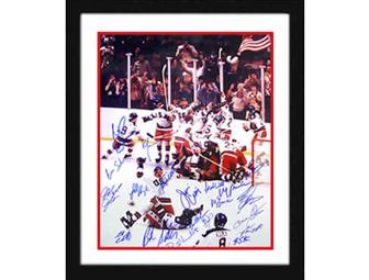 Bids are for a 1980 US Hockey Team hand-signed and framed 16x20 photo. Deemed the 'Miracle on Ice,' the US squad, coached by Herb Brooks, upset the heavily favored Russians at the 1980 Olympic Games in Lake Placid, NY. This moment has been voted the #1 in sports history in the past century time and time again. This "celebration" photograph is signed by all 20 players including Mike Eruzione and Jim Craig. Item comes professionally double-matted and framed. Certificate of Authenticity included.
