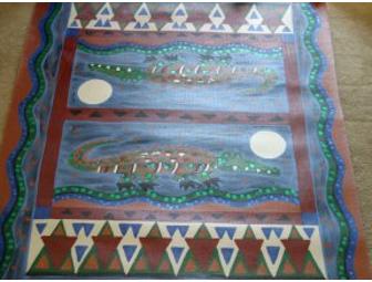 28" x 34" handpainted floor cloth with crocodiles - colors in blue, green and brownish tones. Artist is B. Priestley