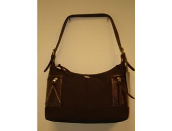 Chocolate brown nylon Mac Douglas handbag with leather strap and pockets
