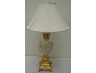 Gold Pineapple Table Lamp. Cut glass crystal pineapple shape lamp with a soft antique gold finish base and top. It has a poly parchment sheer softback shade.