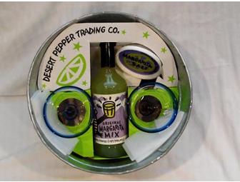Margarita set includes two Mexican margarita glasses with mix and rim salt. These items are nestled inside an aluminum tub which becomes an ice bucket.
