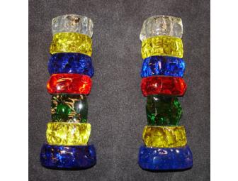 "Hand chipped chunks" of Ocean Glass reflect an exciting rainbow of vivid colors. These contemporary Shabbat candle sticks are each hand fired before being fused together and cured in ultraviolet lighting.