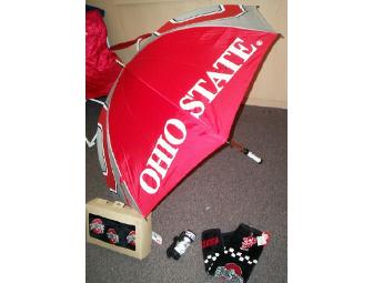 Show your Buckeye spirit on the course with this Ohio State golf gear package!!This wonderful package includes: An oversized Ohio State umbrella, a set of three Ohio State golf balls in a mini-bag, an Ohio State golf towel, and a set of three Ohio State Buckeyes golf head covers. Bid today to pick up this great golf package that makes a wonderful Father's Day gift or treat for the Buckeye fan and golf lover in your life!