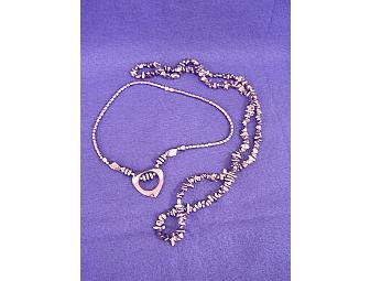 The first necklace includes natural hematite pieces were tumbled and polished in baroque shapes, and then drilled and strung in a 32 inch "endless" length. There are approximately 300 drilled baroque beads in the strand.