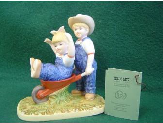Danny and Debbie are at it again, making fun out of their chores. Standing in a grassy field, Danny pushes Debbie in a red wheelbarrow, her arms held high at the joy of the ride. Denim overalls and white T-shirts clothe these two farm kids.