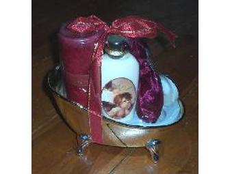 Candle, gel, soap, lotion and bath salts all combined in a gold bathtub.