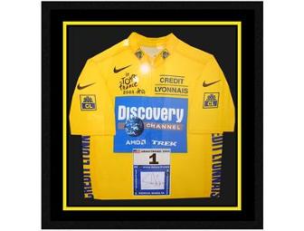 Bids are for a limited edition Lance Armstrong hand-signed and framed official yellow 2005 Tour de France jersey. This jersey, similar to which Lance wore when he won his 7th consecutive Tour de France race, is hand-signed on a first-place race tag that has been fixed to the jersey. Perhaps one of the greatest athletes ever, Armstrong overcame testicular cancer just prior to winning his first of seven Tour de France races. Named the Associated Press Male Athlete of the Year for 2002, 2003 and 2004, Lance Armstrong retired after his 7th, and final, Tour de France victory. Item comes professional double-matted and framed. Certificate of Authenticity included.