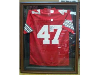 Available for bid is A.J. Hawk's #47 Ohio State jersey, autographed and framed in a deluxe jersey case. Bid today on this superb addition to your favorite Buckeye fan's memorabilia collection.