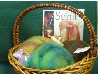 The basket includes Spin It, an instruction book from interweave press, a water mellon design hand-painted, fine-art spindle, two lavender/rosemary sachets, and one bump each of: