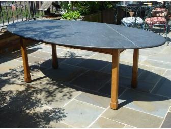 Tuscan style gorgeous oval dining room table with pieta grigia (Italian graystone - a medium gray with lighter veins funneling throughout) table top in very good condition. The table top is 46" x 90" and has a golden pine table base with 29" tall legs. The table is from the former Soho designer showroom Zona . The table has been in the home of a NYC film producer, hosting various celebs including Edward Norton. Shipping/pick-up is the buyer's responsibility.