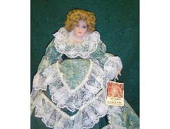 This lovely, collectible, 21" doll is made from fine tinted porcelain bisque parts, enhanced with hand painted details. Only the finest wigs, eyes, and accessories were used. Dressed in a designer costume created from man-made fabrics and laces.