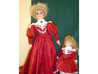 Beautifully dressed in red velveteen with lace, this lovely pair of tinted bisque porcelain dolls are enhanced with hand painted details. Only the finest eyes and wigs are used.