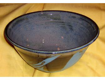 A bowl of blue pottery with blue glaze that is about 9-3/4" wide and 4-1/2" high and made with the caring hands of Ceramic Artist, BHSS Physics Teacher, and Parent of two BHSS students - Mr. Gary Hom.
