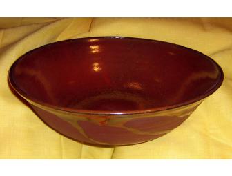 A bowl of rust pottery with rust glaze that is about 11" wide and 3-1/2" high and made with the caring hands of Ceramic Artist, BHSS Physics Teacher, and Parent of two BHSS students - Mr. Gary Hom.