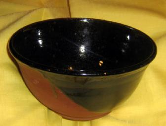 A bowl of rust pottery with black glaze that is about 9" wide and 4-1/2" high and made with the caring hands of Ceramic Artist, BHSS Physics teacher, and Parent of two BHSS students - Mr. Gary Hom.