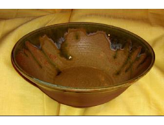 A bowl of rust pottery with gold & green glaze that is about 11" wide and 4" high and made with the caring hands of Ceramic Artist, BHSS Physics Teacher, and Parent of teo BHSS students - Mr. Gary Hom.