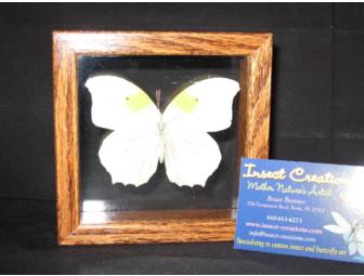 This is a beautiful white and yellow butterfly from Peru in a 4 5/8 square wooden frame. The frame has glass on the front and back so that you can view both sides of the butterfly. The following is a quote from the donor: "The butterfly is REAL and are farm raised (NOT wild caught and killed). They live a natural life and they are hand collected after they die so that we may enjoy their beauty."