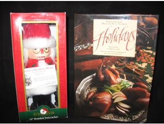 Add a charming hand-crafted, wooden nutcracker to your holiday decorations. This nutcracker by Kurt S. Adler, stands 10" tall and is holding a lantern. "Holidays", the menu cookbook, is filled with a collection of over 150 festive new recipes by celebrated chefs from historic and grand rooms from all over America. Included with the book is a cassette containing a festive holiday dinner concert by San Francisco String Quartet with flute, harp, and harpsichord.