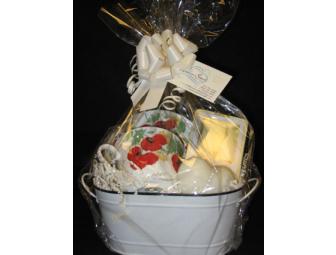 Relax and pamper yourself with a cup of tea in this fine bone china tea cup by Roy Kirkham. The tea is by Tea Forte. This cute white metal tub also contains a scented heart-shaped soap and Pre de Provence Body Lotion.