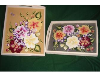 Two wooden trays hand-painted with bright flowers. Paint is acrylic, so it is washable.
