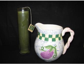 This beautiful unscented candle is green and stands 10 inches tall in a clear glass holder. The blue spongeware ceramic pitcher stands 7 1/4" high and is accented with an egg plant and is trimmed in green and ivory.