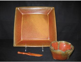 This very beautiful serving set by Hilborn Pottery includes a wooden spreader. The fluted base plate and accompanying twisted dish are oven, micro-wave, and dishwasher-proof. Also included is a display stand by Gibson Holders.