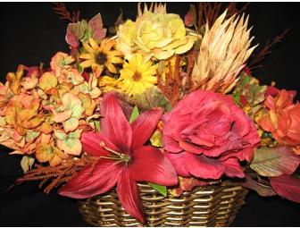 This colorful silk flower arrangement will decorate your home with the warmth of Autumn for years to come. The flowers are in a gold wicker basket and would make a lovely centerpiece.