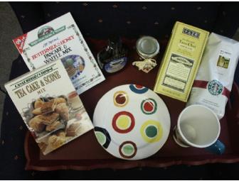 A breakfast tray filled with breakfast goodies-Teacake & Scone Mix, Pancake & Waffle Mix, syrup & jam, Chai Tea, Starbucks Coffee, matching cup & breakfast plate.