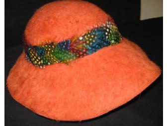 This vintage hat is a brushed orange with a band feathers and beads.