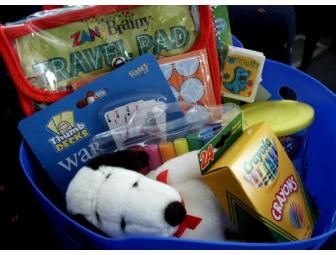 Take along "Keep busies" for those dreaded car trips. Travel tote contains bag of frogs,, Mini Chips Ahoy, Crayola crayons, Snoopy, Washable Markers, Card game, Clip board with Note Pad, Travel game pad with stickers, Spongebob reward decals & certificates.
