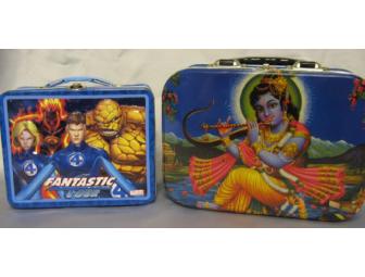 The larger of these two vintage metal lunch boxes has a picture of a Hindu Goddess. The other is the Marvel "Fantastic Four". They are in great condition.