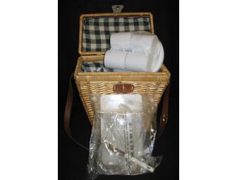 Picnic Basket is lined in green and white checked cotton and has to interior side pockets. Inside you will find four white plastic plates and cups, two wine glasses, a small plastic cutting board and a spreading knife.