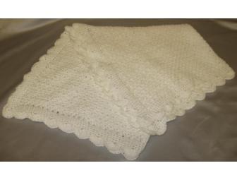White hand-crochet baby blanket with delicate shell stitch edging measures 32" X 33".