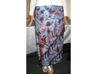 This beautiful Tie Dip Bali Skirt is a wrap-around skit in shades of blue, rust, and black. One size fits all.