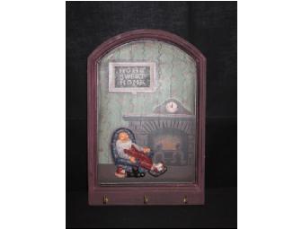 This charming key rack shows Santa resting in front of a warm burning fire with a picture on the wall saying "Home Sweet Home". There are three hooks for your keys. The key rack measures 8" wide X 12" high.