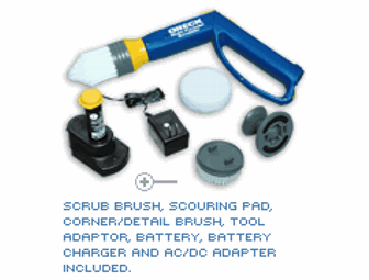 This Oreck Scrubber (Model SCR100) was created specifically to clean all those small, hard-to-reach spots and crevices in bathrooms and kitchens. Included are: corner/detail brush, Scouring Pad, scrub brush, battery charger and adapter.